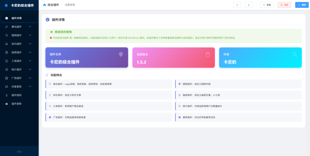 *一体化管理: 一个插件解决八大需求,后台管理更加简洁高效,避免插件过多导致的冲突和臃肿。